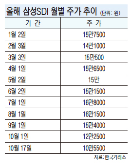 최근 삼성SDI 주가 하락세가 이어지며 10만원 선마저 위협받고 있다. 삼성전자가 올해 2·4분기, 3·4분기 모두 어닝 쇼크를 기록하면서 전자부품이 주력인 삼성SDI의 실적 및 주가도 동반 하락했기 때문이다. 하지만 현재 주가 대비 기업가치가 저평가받는다는 점, 외국인 매수폭 확대 등으로 10만원 선은 과도하게 빠진 것이란 분석도 나온다.