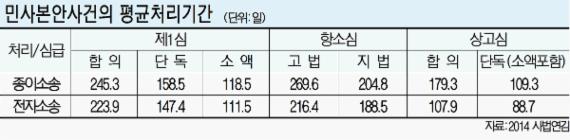 '2014 사법연감'에 따르면 민사본안사건 평균처리기간은 1심의 경우 합의부가 245.3일, 단독부가 158.5일, 소액사건이 118.5일로 집계됐다. 전자소송의 경우 합의부가 223.9일, 단독부가 147.4일, 소액사건이 88.7일로 7~11일가량 빨랐다. 항소심(2심)도 고등법원의 평균 민사본안사건 처리기간이 269.6일인 데 비해 전자소송은 216.4일로 50일 이상 단축됐다. 상고심(3심)의 경우 179.3일이 평균소요 기간인 데 비해 전자소송은 107.9일로 무려 70일이나 빨랐다.