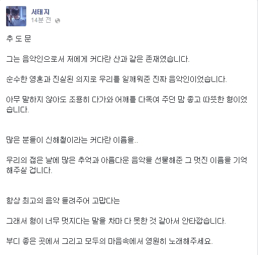 서태지는 28일 자신의 페이스북에 ‘추도문’이라는 제목의 글을 통해 “그는 음악인으로서 저에게 커다란 산과 같은 존재였습니다다”며 “순수한 영혼과 진실된 의지로 우리를 일깨워준 진짜 음악인이었습니다”라고 밝혔다.