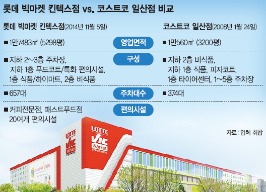 신규 오픈하는 만큼 롯데는 새 점포의 크기와 편의시설 등에서 비교 우위를 갖는다고 보고 있다. 킨텍스점은 지하 3층~지상 2층으로 영업면적이 1만7483㎡(5298평)로 현재 일산지역 유통업체 중 가장 크다. 주차공간도 코스트코(374대)의 2배(657대) 정도 크게 설계했다. 코스트코 일산점은 지하 2층~지상 5층에 1만560㎡(3200평)다.
