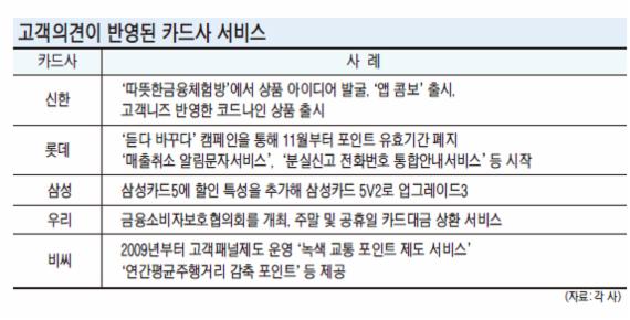 또 현대카드는 지난 2010년부터 본사 1층에 '통곡의 벽'을 설치해 고객들의 의견을 공개해 꾸준히 개선하고 KB국민카드는 고객자문단을 운영해 고객의 다양한 의견을 상품과 서비스, 제도 개선 등에 반영하고 있다.
