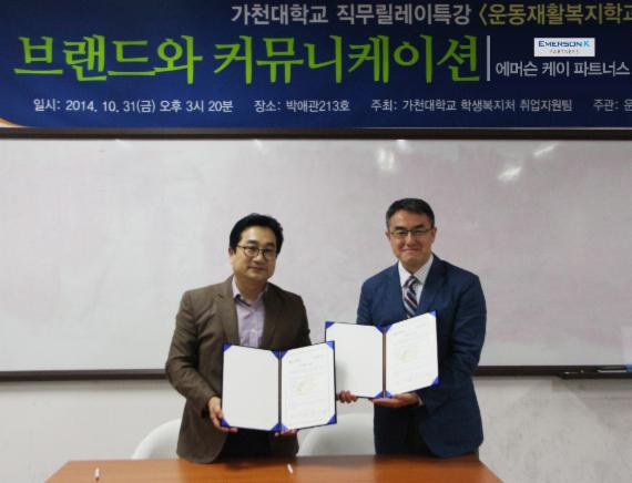 에머슨 케이 파트너스는 가천대학교 운동재활복지학과와 산학협력을 맺고 학생들을 위한 '글로벌 직무 능력 향상 코칭'을 수행해 학생들의 글로벌 직무 능력과 경쟁력 향상에 적극 협력하기로 했다.