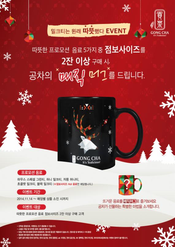 이 이벤트는 공차의 프로모션 음료 5가지 중 2잔을 점보 사이즈 따뜻한 음료로 주문하는 고객에게 한정판 '매직 머그'를 증정한다. 크리스마스 콘셉트의 매직 머그는 블랙 바탕에 하얀 루돌프 이미지가 그려진 디자인으로 제작되었다. 특히 '매직 머그'에 뜨거운 음료를 넣어 마시면 특별한 마법이 눈앞에 펼쳐진다고 관계자는 설명했다.