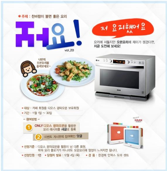 참가를 원하는 고객은 LG DIOS 광파오븐을 활용한 요리 레시피를 오븐&더레시피 카페에 등록하면 된다. 이벤트에 선정된 고객에게는 '한경희 인덱스 도마 세트'를 증정할 계획이다. 당첨자는 12월 4일에 발표될 예정이다.