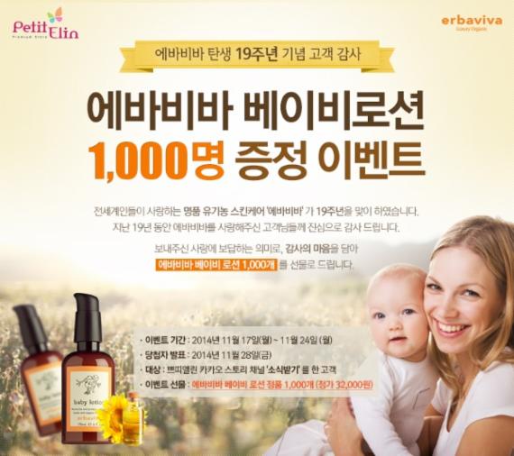 쁘띠엘린의 미국 유기농 스킨케어 브랜드 에바비바가 탄생 19주년을 맞아 베이비로션 증정 이벤트를 실시한다고 17일 밝혔다.