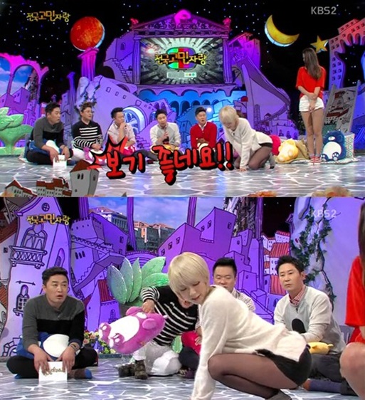 자신이 진행하는 프로그램 SBS '동물농장'이 언급되자 신동엽은 멋쩍은 미소를 지었고 그를 비롯한 MC들은 초아와 설현에게 고양이 흉내를 내달라고 제안했다.