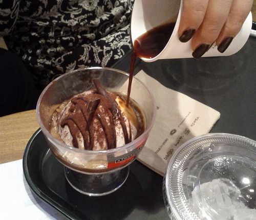 에스프레소를 잔에 부을 때 처음에는 잔 벽을 흐르도록 붓고, 1/3정도는 아이스크림 위에 끼얹는다. 기호에 따라 잔 아래 깔리는 양과 아이스크림 위에 붓는 양을 조절하면 된다.
