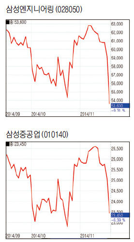 19일 유가증권시장에서 삼성중공업과 삼성엔지니어링은 각각 6.39%, 9.31%나 주가가 빠졌다. 합병 결정 발표일인 지난 9월 초에 비해 삼성중공업은 19%, 삼성엔지니어링은 25%나 떨어졌다.