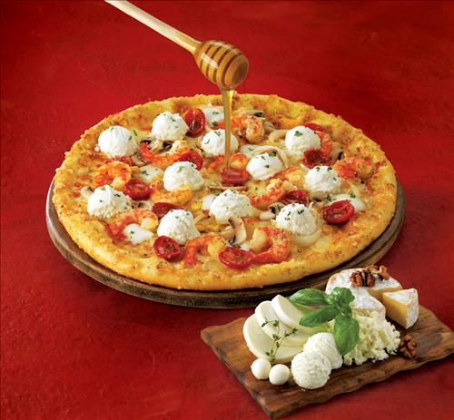 올댓치즈 피자는 보코치니 치즈, 리코타 치즈, 모짜렐라 치즈, 까망베르 크림치즈 등 4가지 치즈와 시트러스 드레싱으로 양념한 새우가 어우러진 제품이다.