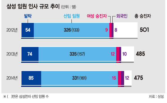 지난해 총 승진 규모는 475명으로 전년(501명)보다 다소 줄었다. 하지만 신임 임원 승진자는 331명으로 2013년(335명), 2012년(326명)과 큰 차이가 없었다. 특히 2006년 이후 최대 규모인 85명을 발탁 승진시켜 삼성을 젊고 역동적 조직으로 변화시키려는 의지를 나타낸 바 있다.