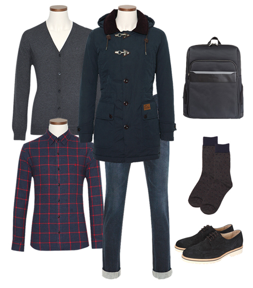 가장 기본적인 스타일로 심플하게 니트와 매치해도 좋다. 좀 더 댄디하게 소화하고 싶다면 카디건과 셔츠를 레이어드하고 롤업한 청바지로 감각적인 스타일을 완성해보자. 백팩과 패턴 양말, 캐주얼 로퍼를 더해 전체적인 스타일에 완성도를 더한다. 더플 코트는 20대 남성들의 위크엔드룩은 물론 옷차림에 구애를 받지 않는 회사원들의 출근용 아이템으로도 딱이다.