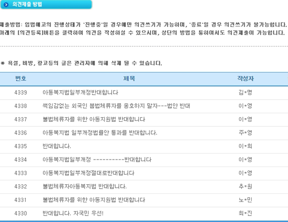 네티즌 박모씨는 “불법체류자보다 현재 고통받고 있는 대한민국의 국민들을 위해 일하시길 바랍니다. 국민들의 세금은 온전히 국민들을 위해 쓰여야 합니다”라고 강조했다. 최모씨는 “진행 중인 무상급식도 철폐하는 마당에 불법체류자 아동 복지라니요. 결사 반대합니다”라고 밝혔으며, 신모씨는 “우리나라에 유입되는 불법체류자 자녀는 전보다 훨씬 늘어날 것”이라고 지적했다.