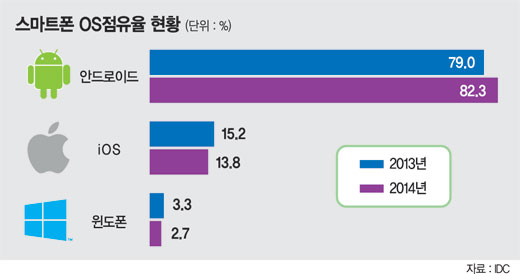 지난해 세계 스마트폰 시장에서 안드로이드 OS의 점유율은 79%였다. 올해는 3.3%포인트가 늘어난 것이다.