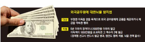 7일 법조계에 따르면 1998년 제정된 국제상거래 뇌물방지법은 우리나라 기업이나 국민이 국제상거래 과정에서 외국공무원에게 뇌물을 제공하는 것을 처벌토록 규정하고 있다.