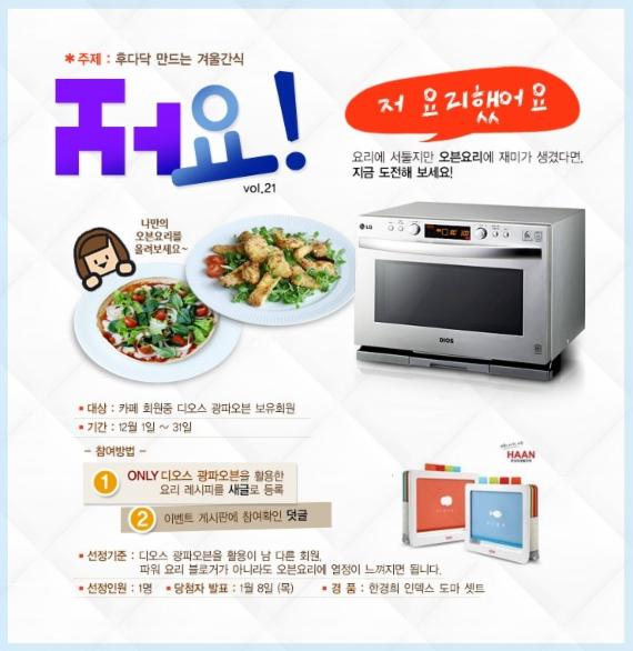 이벤트는 LG전자 광파오븐 네이버 카페 오븐&더레시피(http://cafe.naver.com/ovenwon)를 통해 진행된다. 응모를 희망하는 고객은 DIOS 광파오븐을 활용해 겨울철 따끈하게 먹을 수 있는 간식을 만들고, '저요(저 요리했어요!)' 이벤트 게시판에 레시피를 등록한 후 참여확인 댓글을 남기면 된다.