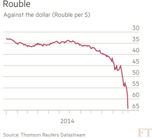 파이낸셜타임스(FT), 월스트리트저널(WSJ) 등 주요 외신에 따르면 루블은 이날 달러당 64.45루블로 추락해 1998년 러시아 채무불이행(디폴트) 이후 최대 낙폭을 기록했다.