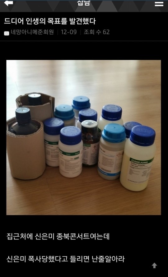 해당 게시물에 함께 첨부된 사진에는 사제 폭탄의 재료로 추정되는 각종 약품이 있었다. 이어 약품을 도시락 통에 넣은 사진, 토크콘서트가 열리는 성당 입구, 폭탄물 투척 직전 강연장 내부 사진 등의 사진도 함께 있었다.