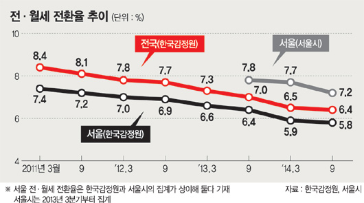 저금리 기조 등으로 사실상 월세 시대에 들어서면서 세입자에게 큰 부담인 월세를 낮추기 위해 여야가 주택임대차분쟁조정위를 설치, 적정 임대료 산정과 조사 기능을 부여하고 전·월세 전환율을 적정 수준으로 인하하기로 합의했으나 일각에서는 전·월세 전환율이 적정 수준을 찾아가는 중이라고 진단한다.