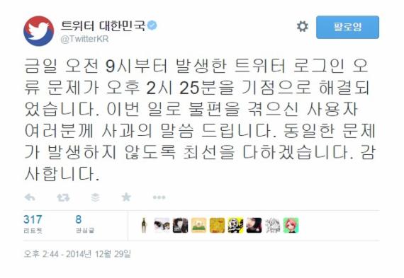 트위터 한국 공식 계정인 '트위터 대한민국'은 29일 오후 2시 45분께 "금일 오전 9시부터 발생한 트위터 로그인 오류 문제가 오후 2시 25분을 기점으로 해결됐다"고 밝혔다.