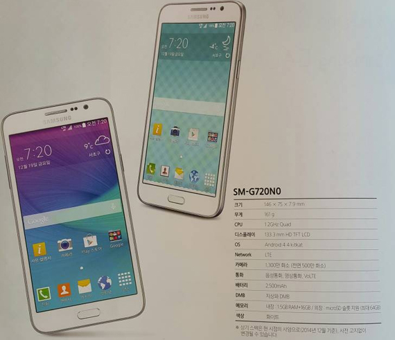 문건에 따르면 '갤럭시그랜드 맥스(SM-G720N0)'는 크기가 146 x 75 x 7.9mm, 무게는 161g이며 5.2인치 HD 화면, 1.2기가헤르츠(GHz) 쿼드코어 프로세서, 안드로이드 4.4 킷캣, 1300만 화소 후면 카메라(전면: 500만 화소)를 탑재했다.