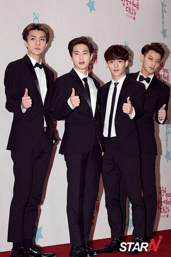 그룹 엑소 세훈-수호-첸-타오가 29일 오후 서울 상암동 MBC 미디어센터에서 열린 '2014 MBC 연예대상’ 레드카펫 행사에 참석한 가운데 포토타임을 갖고 있다.