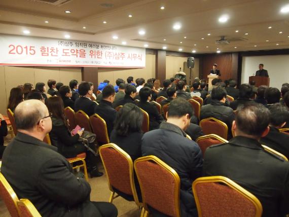 지난 2일 울산 울주 진하호텔&리조트에서 열린 시무식에서 ㈜삼주 임직원들이 백승용 삼주 회장의 기념사를 듣고 있다.