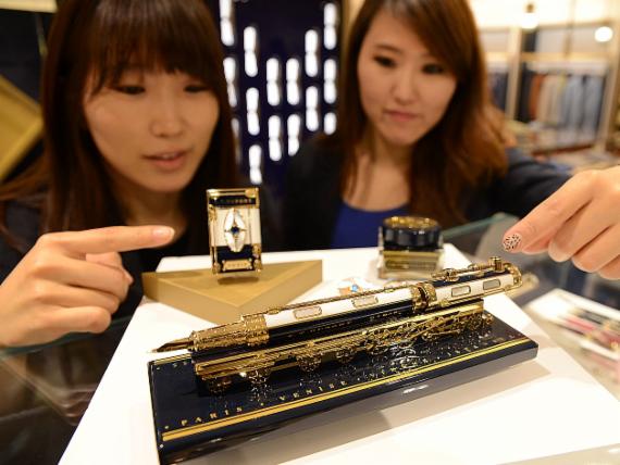 부산 부전동 롯데백화점 부산본점 에비뉴엘관 1층 '듀퐁' 매장에서 과거 유럽 대륙의 교통수단이던 오리엔트 열차 모양의 만년필 세트를 선보여 매장직원들이 살펴보고 있다.