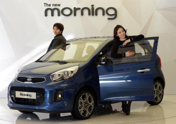 이날 오전 서울 강남구 압구정동 기아차 전시장에서 모델들이 '더 뉴 모닝'을 선보이고 있다. /사진=박범준 기자
