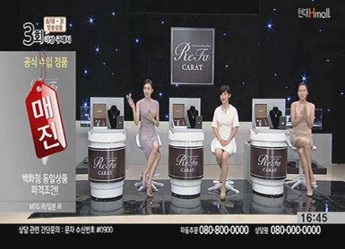 홈쇼핑 방송시간은 주말 저녁 드라마가 끝나는 시간인 프라임 타임 시간대를 선점했어요. 방송 중에는 반드시 5명 이상의 모델을 섭외해요. 직접 제품을 사용해보고 효과를 보여주는 시연을 중점적으로 다루고 있죠.