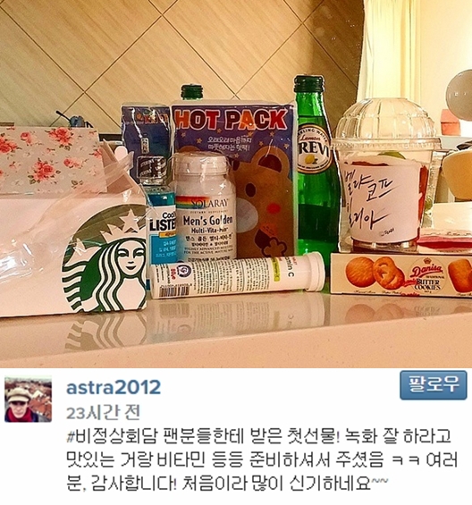 지난 11일 벨랴코프 일리야는 자신의 인스타그램을 통해 “JTBC ‘비정상회담’ 팬분들한테 받은 첫 선물! 녹화 잘 하라고 맛있는 거랑 비타민 등등 준비하셔서 주셨음. 여러분, 감사합니다. 처음이라 많이 신기하네요”라는 글과 함께 한 장의 사진을 게재했다.