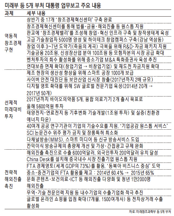 5개 기관 공동 업무보고의 가장 큰 틀은 △역동적 창조경제 구현 △선제적 미래대비 투자 △전략적 해외진출 촉진이다.