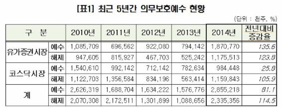 20일 한국예탁결제원에 따르면 2014년 의무보호예수 상장주식은 28억5521만8000주로 전년 대비 81.1% 증가하며 최근 5년 내 최고치를 기록했다. 의무보호예수가 해제된 주식은 23억3535만6000주로 114.5% 늘었다.
