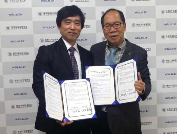 원광디지털대는 한국행정사협회와 업무협약(MOU)을 맺고 교육 콘텐츠 개발 등 교류 협력을 강화한다고 22일 밝혔다. 양측은 교육 콘텐츠 개발에 대한 교류 협력, 학술 및 인적 교류 확대, 단체협약 장학금 지원 등에 합의했다. 한국행정사협회 회원 및 임직원이 원광디지털대에 입학 시, 수업료 30%를 감면받을 수 있다. 원광디지털대 입학협력처장 김효철 교수(왼쪽)와 한국행정사협회 김용준 회장이 협약식 후 기념촬영을 하고 있다.