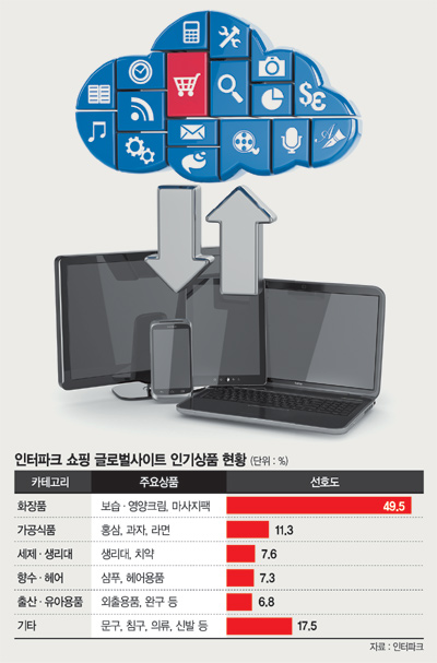 인터파크 쇼핑 글로벌 사이트에서 판매되는 주요 상품 중 보습·영양크림, 마사지팩 등 화장품 판매 비중이 49.5%였고 홍삼·과자·라면 등 가공식품이 11.3%, 문구와 침구·의류·신발 등이 17.5% 비중을 보였다.