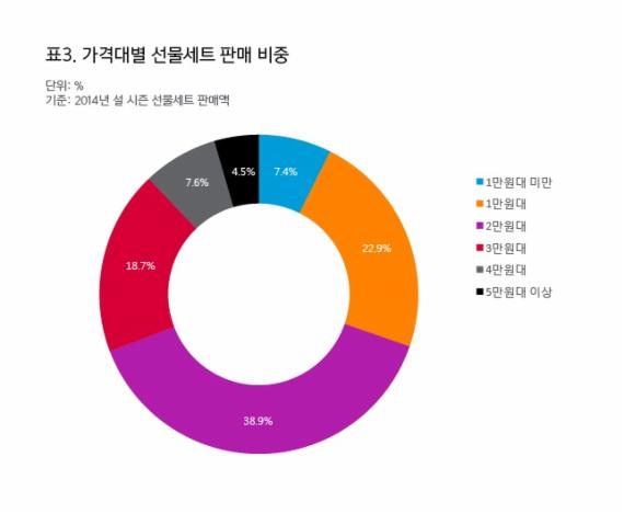 불황으로 저렴한 선물세트의 판매가 압도적이었다. 설 설물세트 평균 가격대는 2만원대가 전체 판매액의 38.9%, 1만원대가 22.9%를 차지해 2만원 미만 선물 비중이 61.8%를 차지했다. 3만원대(18.8%), 4만원대(7.6%), 1만원 미만(7.4%), 5만원 이상(4.5%) 등이 뒤를 이었다.