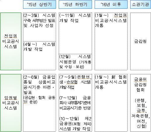 전업권 비교공시 시스템은 금감원이 올해 말까지 시스템 구축 완료 후 내년 1월 개통하고 업권별 비교공시 시스템은 각 협회가 올해 말까지 시스템 개발을 순차적으로 마치고 내년 1월 시행할 방침이다.