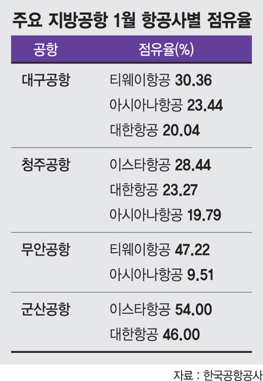 6일 항공업계에 따르면 1월 여객 수를 기준으로 김포국제공항과 김해국제공항, 제주국제공항을 제외한 11개 국내 공항 가운데 대구공항과 청주공항, 무안공항, 군산공항은 LCC가 당당히 '넘버원'의 자리를 차지했다. 대구공항은 티웨이항공, 청주공항은 이스타항공, 무안공항은 티웨이항공, 군산공항은 이스타항공이 장악했다.