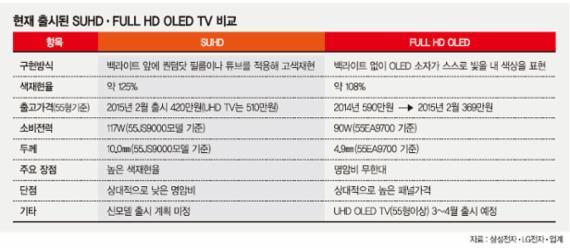 현재 삼성전자와 LG전자가 주력으로 내세운 TV는 각각 SUHD TV(LCD에 퀀텀닷 필름을 붙인 TV), 유기발광다이오드(OLED) TV로 소비자들의 개인 취향과 눈높이 등이 어느 쪽으로 쏠리느냐에 따라 국내 시장판도가 달라질 전망이다. SUHD TV는 액정표시장치(LCD)에 필름을 붙여 화질을 끌어올린 퀀텀닷(양자점) TV로 '나노크리스탈' 등 삼성 독자기술을 접목해 특화한 게 특징이다. OLED TV는 CRT→PDP→LCD 다음을 잇는 차세대 TV로 그동안 단점으로 지적됐던 높은 가격이 눈에띄게 낮아지면서 관심을 끌고 있다.