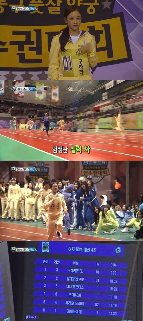 구하라는 9.33초의 기록으로 가볍게 '아육대' 예선을 통과하고 결선에 이름을 올렸다.