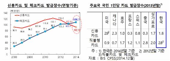 24일 한국은행이 발간한 '2014년 중 지급결제동향'에 따르면 지난해 말 현재 신용카드 발급장수는 9230만장으로 1년 전보다 970만장(9.5%) 줄었다. 신용카드 발급장수는 지난 2008년(9620만장) 이후 6년 만에 1억장 아래로 떨어졌다.