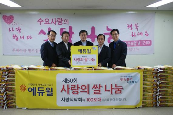 종합교육기업 ㈜에듀윌(eduwill.net)은 지난 24일 서울시 영등포구 문래동에 위치한 사랑식탁회에 '사랑의 쌀'을 기증했다고 밝혔다. 2011년 1월부터 시작된 에듀윌의 '사랑의 쌀 나눔 행사'는 매월 꾸준히 이어져 이달로 50회째를 맞는다.