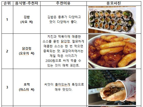 이를 활용해 한국여행에 대한 관심을 불러일으키고자 기획된 이번 콘테스트는, 일본인들이 추천하는 한국의 B급구르메를 사진, 코멘트와 함께 추천하는 형태로, 총 807건 응모됐다. 이중 20개의 음식을 뽑아, 다시 일본인의 SNS투표(참여자 672명)로 순위를 정한 결과, 김밥이 1위를 차지하였으며, 닭강정, 호떡이 그 뒤를 이었다.