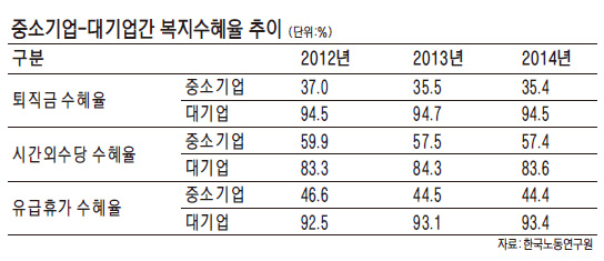 중소기업의 복지수혜율도 악화되고 있다. '좋은 기업' '좋은 복지'의 기준이 되는 퇴직금이나 상여금, 시간외 수당 등은 후퇴하는 모습이다. 중소기업의 퇴직금 상여율은 최근 3년간 37%에서 35.4%로 떨어졌고, 시간외 수당 수혜율도 59.9%에서 57.4%로 고꾸라졌다. 유급휴가 수혜율도 46.6%에서 44.4%로 하락했다. 같은 항목에서 대기업은 90%대 중반의 높은 비율을 유지했다.
