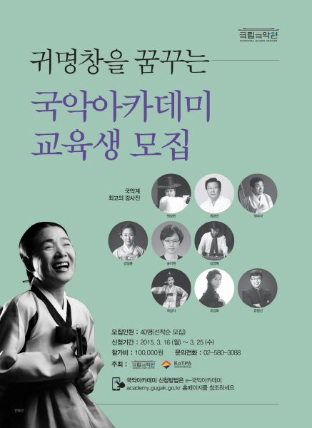 김해숙 국악원장은 "이번 국악아카데미는 누구나 국악을 즐기면서 인생을 풍요롭게 할 수 있도록 국악 감상의 첫걸음부터 귀명창까지 안내해줄 수 있는 교육내용 구성에 주력했다"고 말했다. 수강 신청은 국악에 관심 있는 사람이면 누구나 가능하며 접수는 16~25일 까지 e-국악아카데미 홈페이지(academy.gugak.go.kr)를 통해 40명까지 선착순 모집한다. 참가비는 1인당 10만원. 강좌는 4월 2일부터 매주 목요일, 총 10회로 운영한다. (02)580-3056