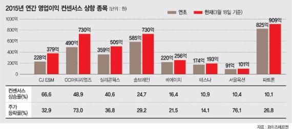 이 외에도 영업이익 전망치 상승률이 66%로 가장 높게 나타난 CJ E&M은 연초 대비 주가가 32.9% 올랐고 실리콘웍스, 솔브레인 등도 각각 36.8%, 29.2% 가량 주가가 올랐다.