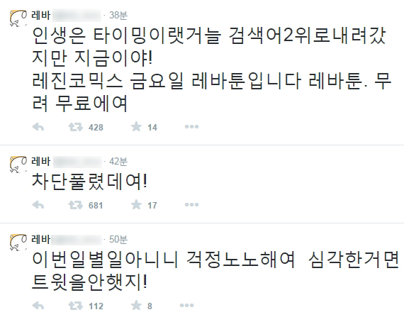 이후 차단이 풀리자 레바 작가는 “차단 풀렸대요! 인생은 타이밍이랬거늘 검색어 2위로 내려갔지만 지금이야!”라며 “레진코믹스 금요일 레바툰입니다 레바툰. 무려 무료예요”라며 자신의 만화 홍보에 열을 가해 웃음을 자아냈다.