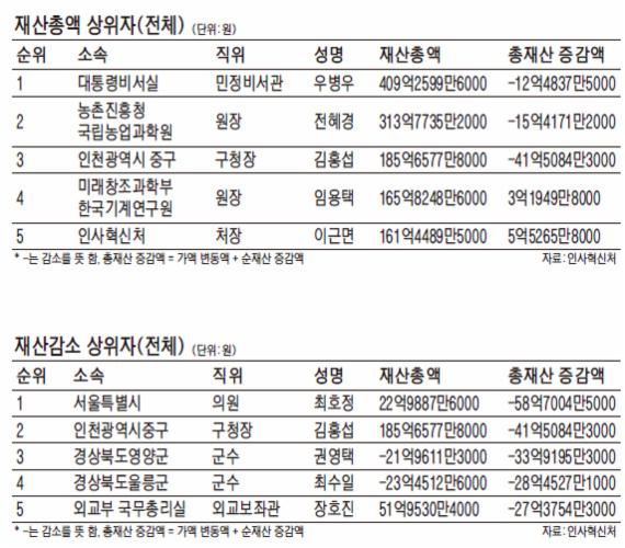 이어 김홍섭 인천 중구청장(185억6000만원), 임용택 한국기계연구원장(165억8000만원), 이근면 인사혁신처장(161억4000만원), 백종헌 부산시의원(137억원), 성중기 서울시의원(132억4000만원), 이현호 경기도의원(124억2000만원), 이복근 서울시의원(118억1000원), 조성제 대구시의원(116억원) 등이 상위 10위에 랭크됐다.