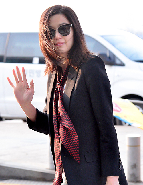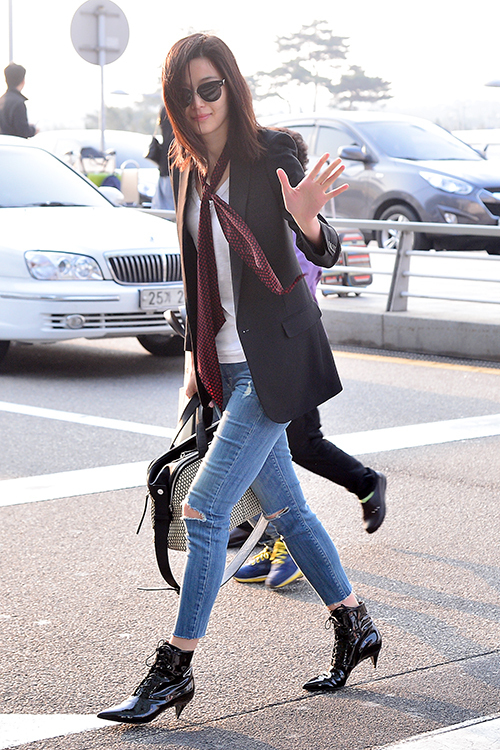 전지현은 무심한 듯 스타일리시한 공항패션을 선보였다. 아무에게나 잘 어울리기 힘든 흰색 티셔츠와 찢어진 청바지도 잘 소화했다. 여기에 블랙 재킷과 구두, 선글라스로 시크함을 더했다. 와인컬러의 스카프를 재치 있게 매치해 포인트를 더했다.