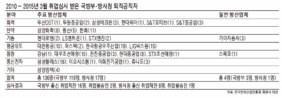 국방부 퇴직자의 경우 재취업한 318명의 38.36%(122명), 방사청의 경우 재취업자 31명의 58.0%(18명)가 각각 방산업체에 발을 들였다. 업체별로는 현재 감사원이 방산비리로 감사를 벌이고 있는 한국항공우주산업이 19명으로 가장 많았고, 삼성탈레스가 18명으로 두 번째였다.