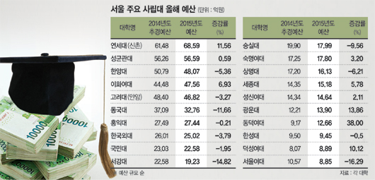 서울지역 사립대 절반이 올해 예산을 줄였다. 예산 규모가 큰 대학의 감소폭이 컸다. 지난해 보다 두자릿수를 줄인 곳도 있다. 예산을 늘린 대학들도 상당수가 건물을 짓기 위한 것이어서 구성원들이 체감하기엔 부족할 전망이다.